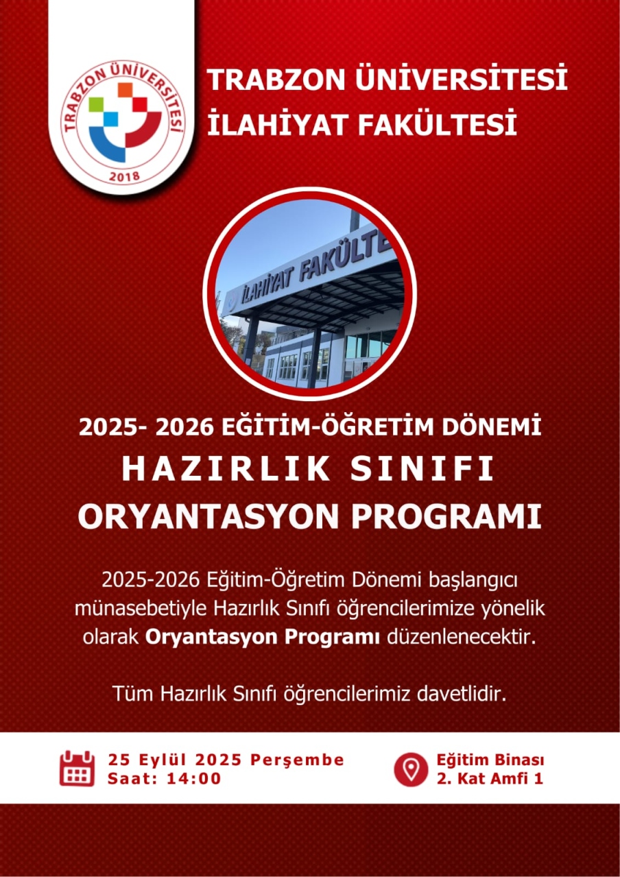 Trabzon Üniversitesi İlahiyat Fakültesi’nde 2025-2026 Eğitim-Öğretim yılı hazırlık sınıfı öğrencilerimizin fakültemize ve üniversitemize uyum sağlamalarına katkı sunmak amacıyla Oryantasyon Programı düzenlenecektir.