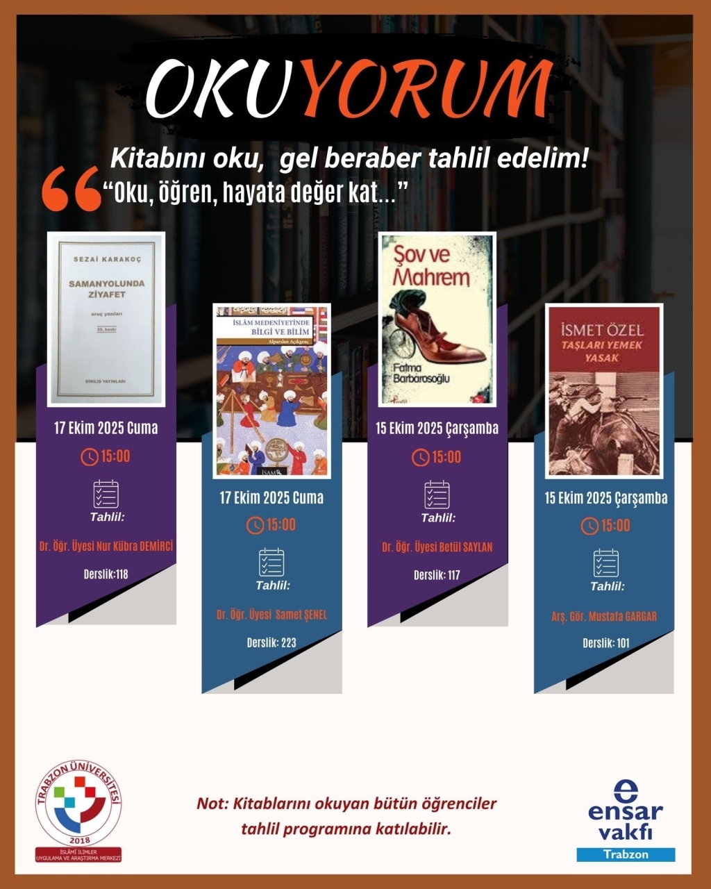 İslâmî İlimler Uygulama ve Araştırma Merkezi ve Ensar Vakfı koordinatörlüğünde TRÜ İlahiyat Fakültesi öğrencilerine yönelik olarak "Okuyorum, Kitabını Oku, Gel Beraber Tahlil Edelim" programı kapsamında Ekim 2025 dönemi kitap tahlilleri yapılacaktır: