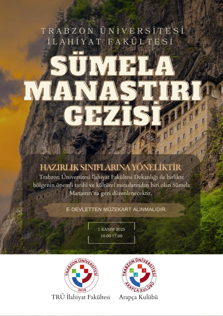 Trabzon Üniversitesi İlahiyat Fakültesi Dekanlığı ve Arapça Kulübü işbirliğiyle bölgenin önemli tarihî ve kültürel miraslarından biri olan Sümela Manastırı'na gezi düzenlenecektir. Bu gezi kapsamında katılımcılar, manastırın tarihî dokusunu, mimari özelliklerini ve bölgenin doğal güzelliklerini yerinde inceleme imkânı bulacaklardır.