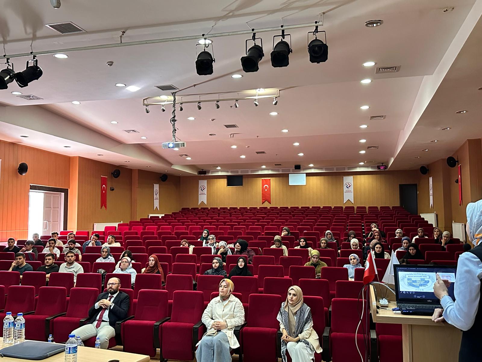 2025-2026 akademik yılının başlangıcı münasebetiyle 7 Ekim 2025 tarihinde fakültemiz 2, 3 ve 4. sınıf öğrencilerimize yönelik bir buluşma gerçekleştirildi. Fakültemiz konferans salonunda gerçekleştirilen program Dekanımız Prof. Dr. Cemil HAKYMEZ’in açılış konferansı ile başladı. Ardından Dekan Yardımcımız Doç. Dr. Semra ÇİNEMRE, akreditasyon sürecinin öğrencilerimize yansıyan boyutlarını ele alan bir sunum gerçekleştirdi. Öğrencilerimizle buluşma lisans öğrencilerine yönelik 2209-A Tübitak Proje modülünün tanıtımı ile devam etti. Fakültemiz Proje ve Ar-Ge Komisyonunun gerçekleştirdiği sunumda ilgili proje türünün temel özellikleri, başvuru koşulları ve başvuru süreci hakkında ayrıntılı bilgi verildi. Sunumda öğrencilerimizle alternatif proje konuları ve proje yazım süreci ile ilgili fikir alışverişinde bulunuldu. Sunumun sonunda Tübitak projesine başvurmayı hedefleyen öğrenciler için bir eğitim semineri planlandı. Program bilgilendirme sunumlarının ardından öğrencilerimiz için hazırlanan ikramlarla sona erdi.
