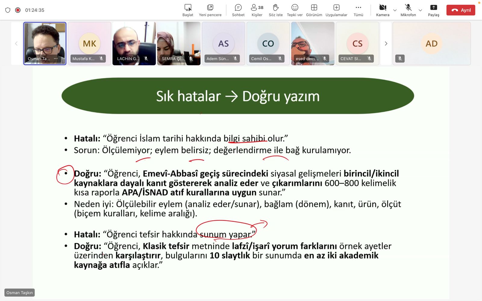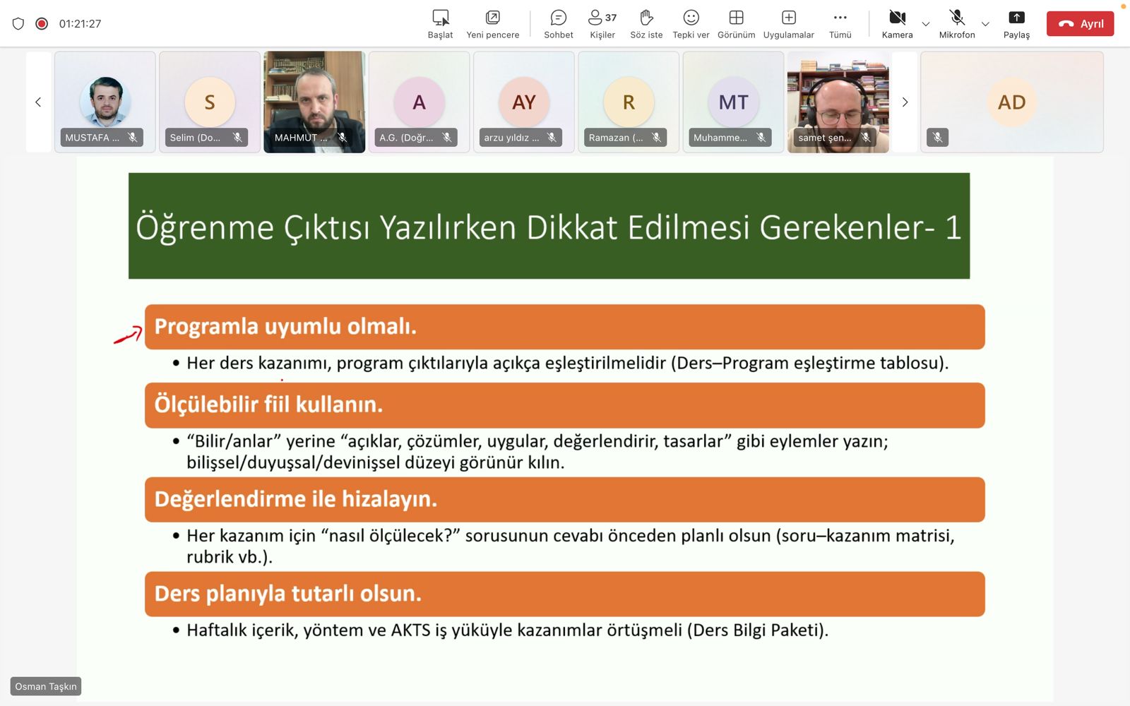 Programda ayrıca, AKTS ve iş yükü hesaplaması, ders öğrenme çıktılarıyla uyumlu soru yazımı, öğrenci merkezli ölçme araçları ve kanıt yönetimi gibi konulara da yer verildi.