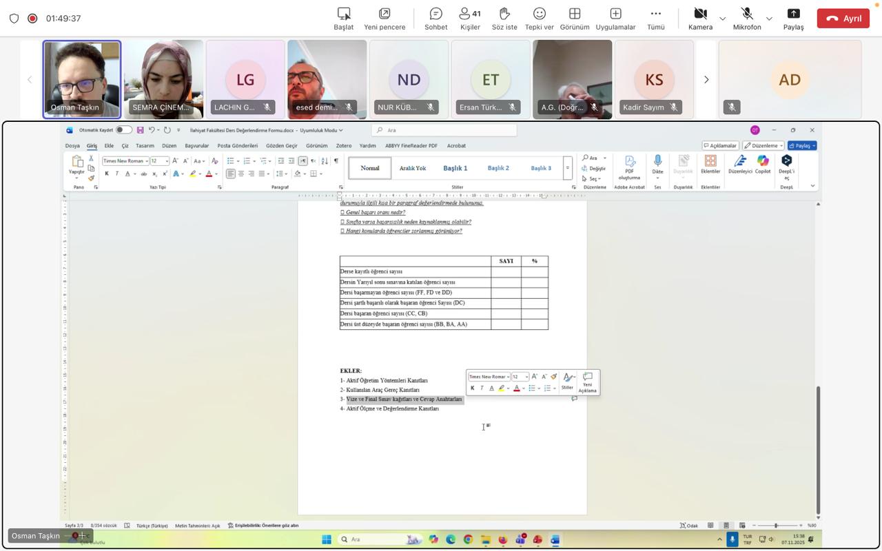 Eğitim sürecinde, öğretim elemanlarının hazırlayacağı ders değerlendirme raporlarının; programın sürekli iyileştirilmesi, öğrenci deneyiminin izlenmesi ve akreditasyon süreçlerine katkı sağlayacağı ifade edildi.
