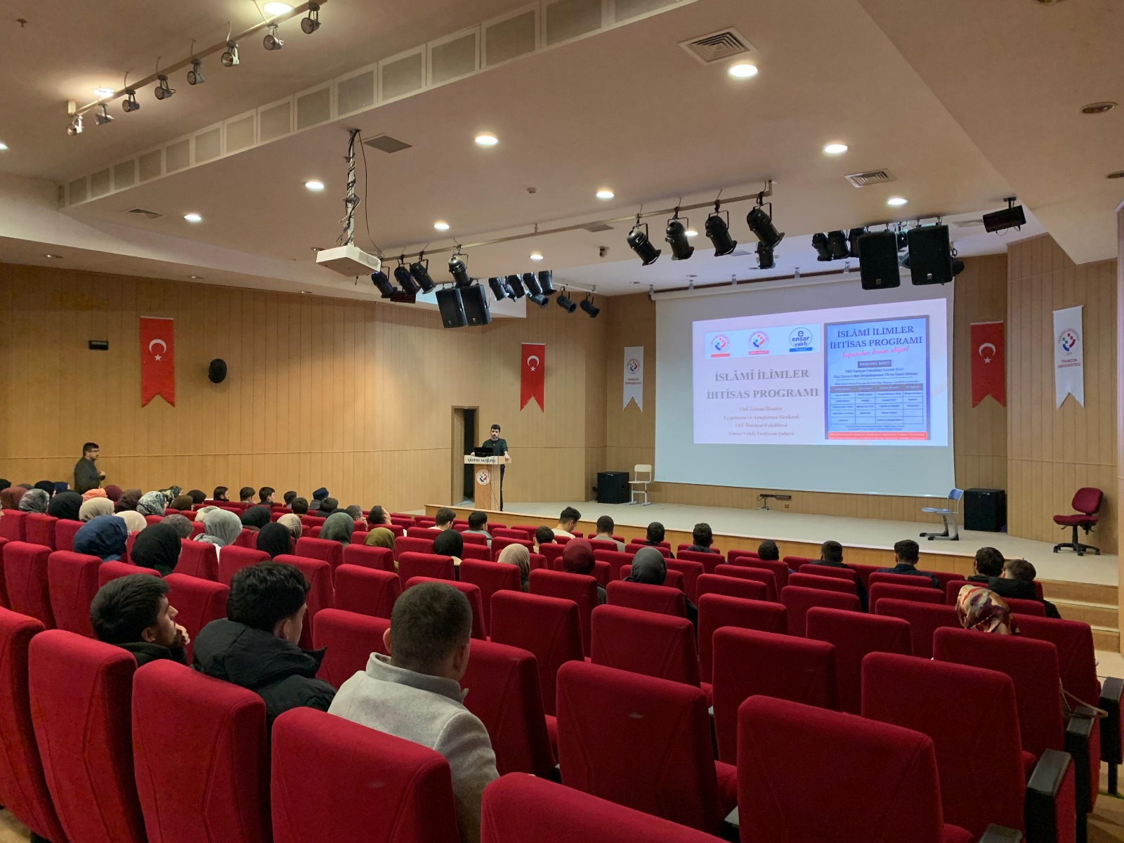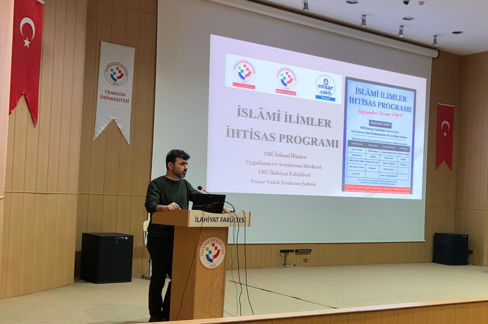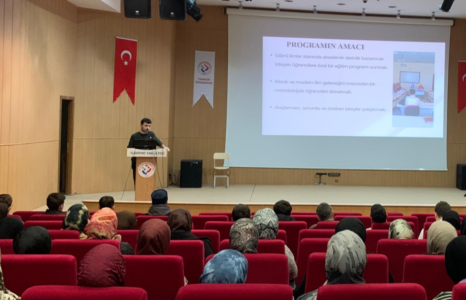 Trabzon Üniversitesi İlahiyat Fakültesi Hazırlık Sınıfı öğrencilerine yönelik olarak düzenlenen toplantıda, TRÜ İslâmî İlimler Uygulama ve Araştırma Merkezi Yönetim Kurulu Üyesi ve aynı zamanda İslâmî İlimler İhtisas Programı Koordinatörü Doç. Dr. Şenol Saylan tarafından programın amacı, kapsamı, eğitim içeriği ve uygulama esasları hakkında ayrıntılı bilgilendirme yapıldı.